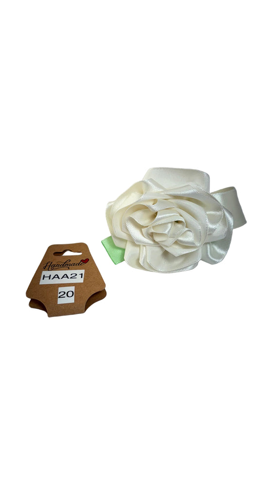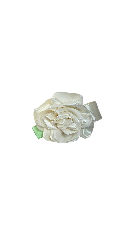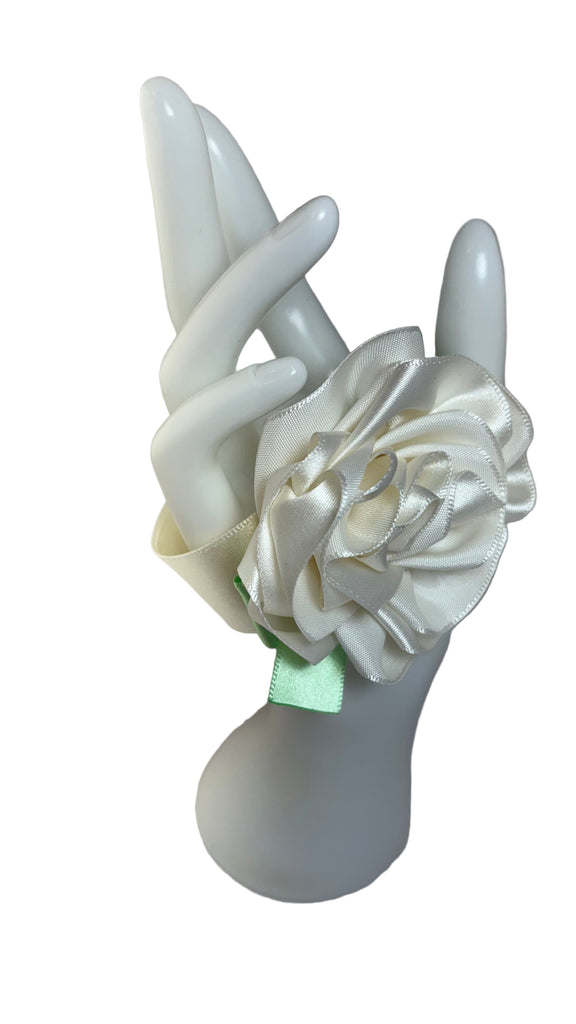 Ivory satin rose with green satin bow, ivory satin ribbon band