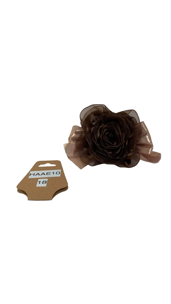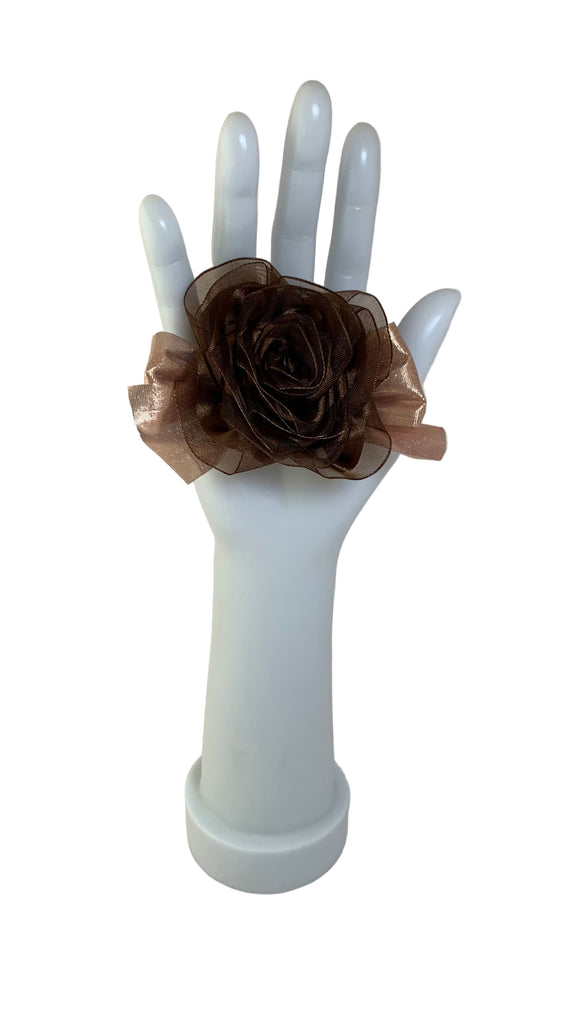 Brown organza rose with pink iridescent satin bow