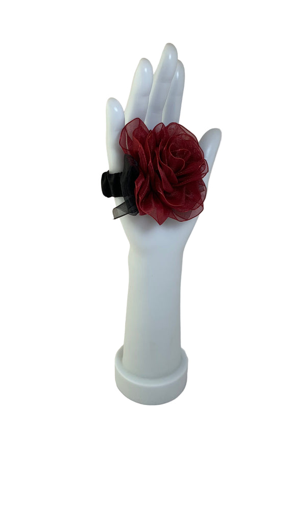 • Burgundy organza rose with black organza bow