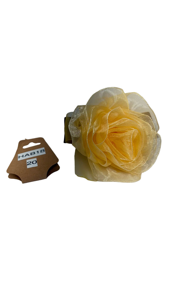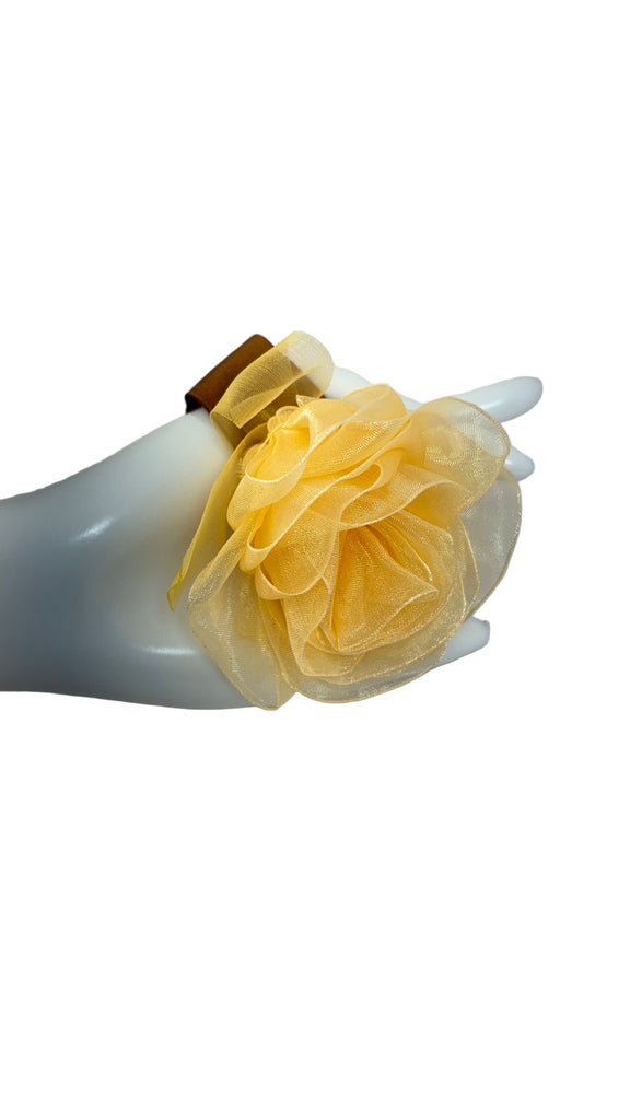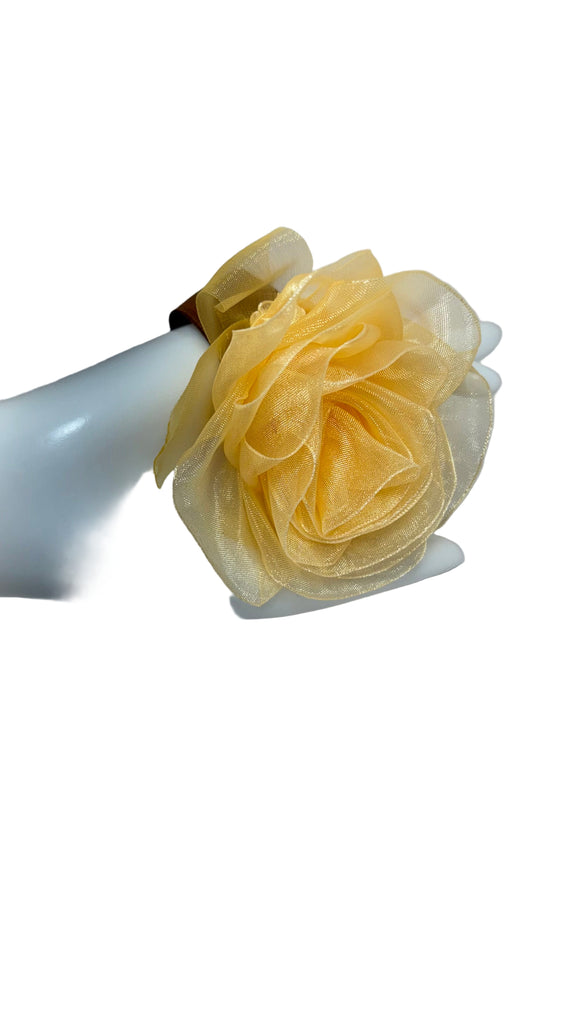 Orange organza rose with orange organza bow, bronze satin ribbon band