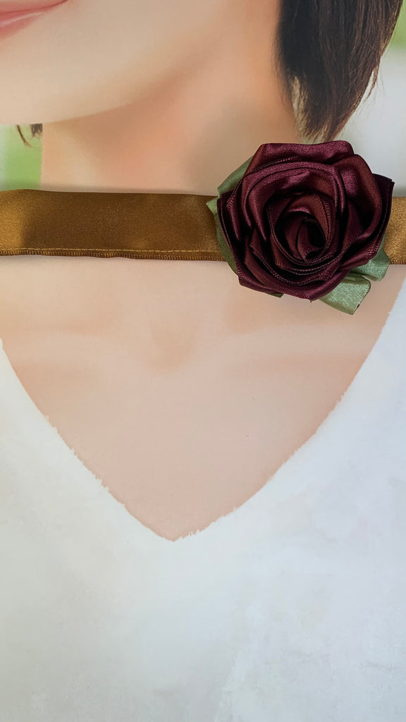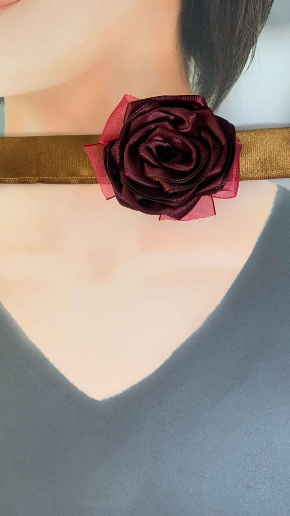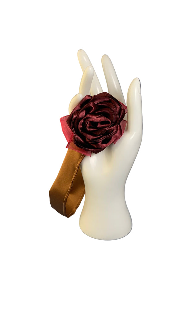 Burgundy satin rose with red organza bow, bronze satin ribbon band