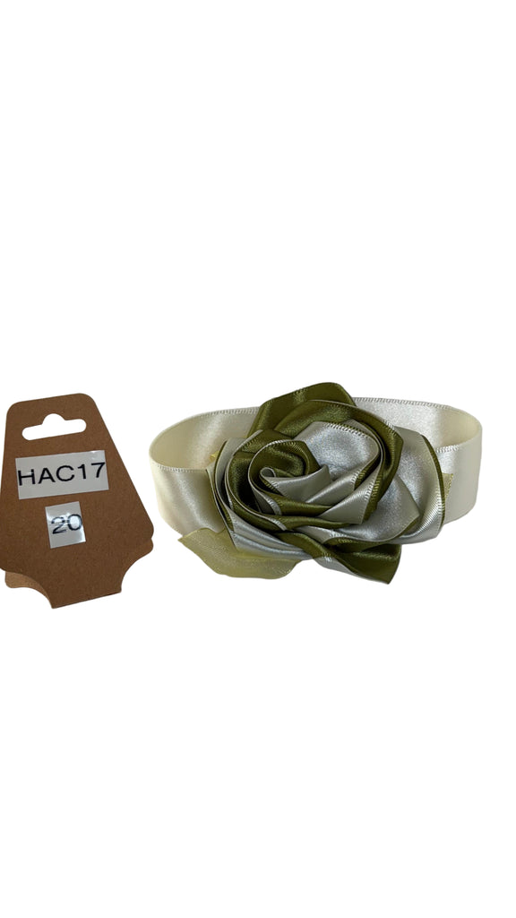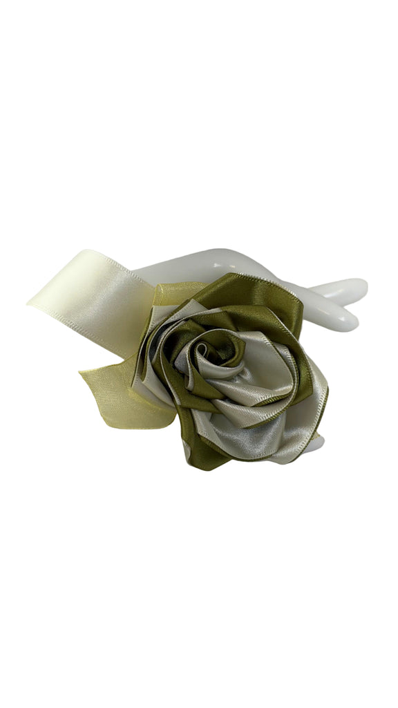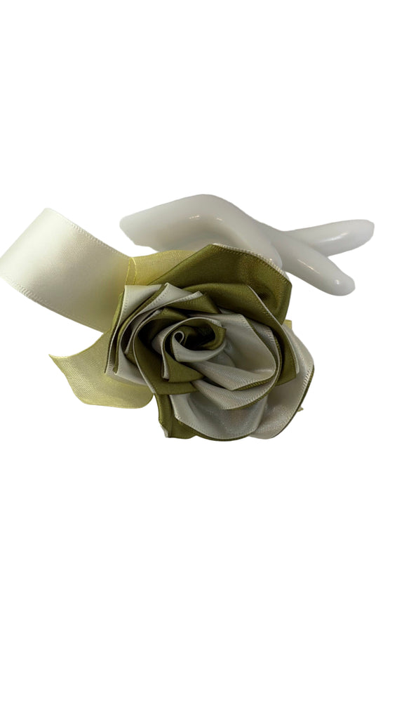 Olive/ivory satin rose with yellow organza bow, ivory satin ribbon band