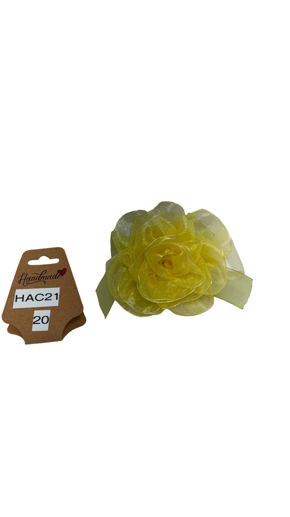 Yellow organza rose with mint organza bow, ivory satin ribbon band