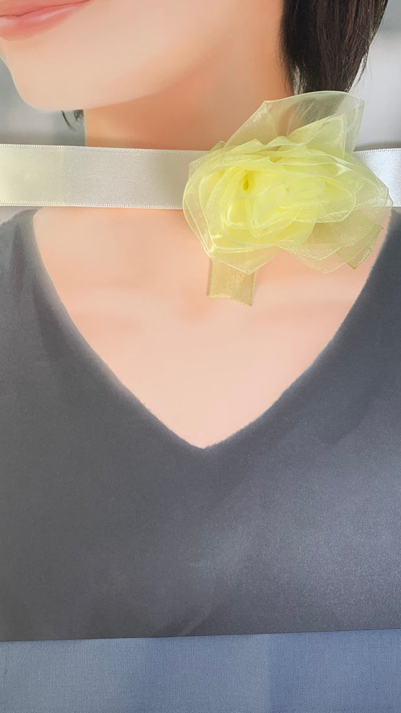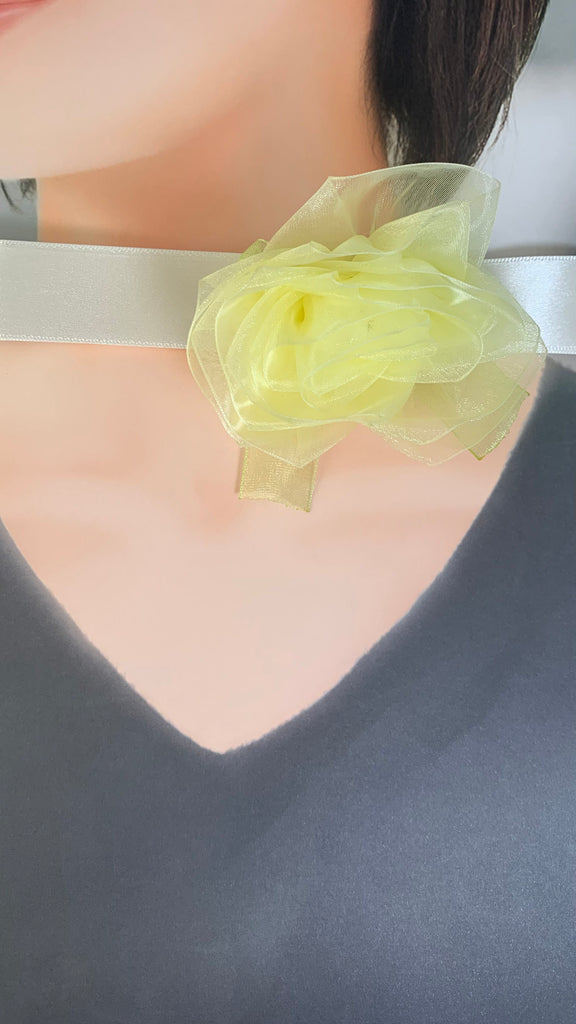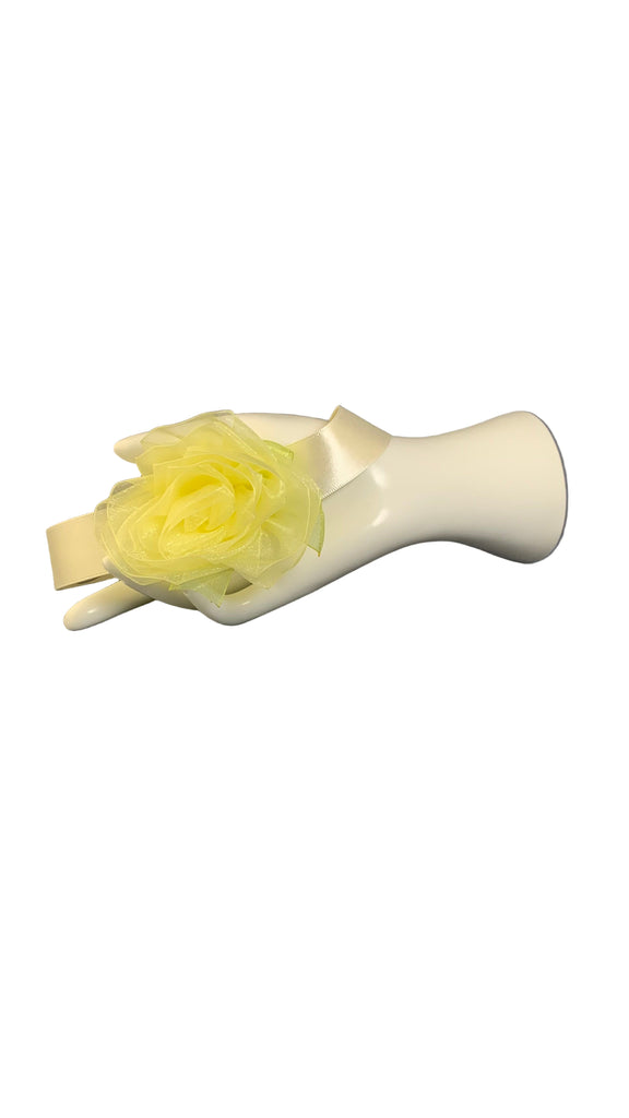 • Lt Yellow organza rose with Lt yellow organza bow, Ivory ribbon band