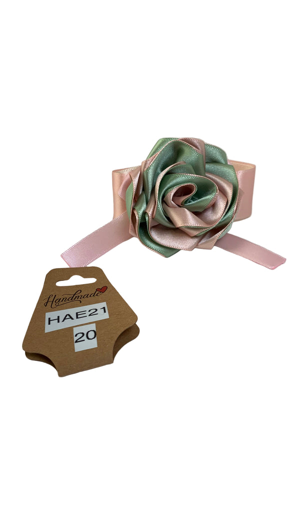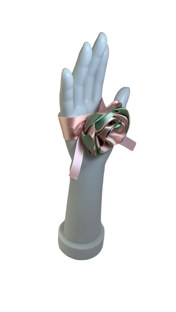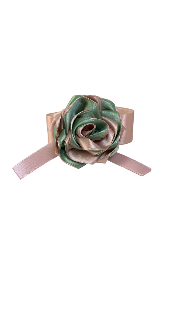 Green/pink satin rose with pink satin bow, blush/ivory satin ribbon band