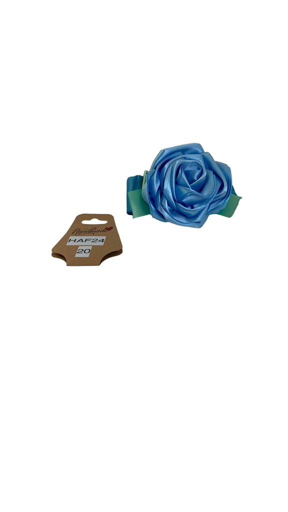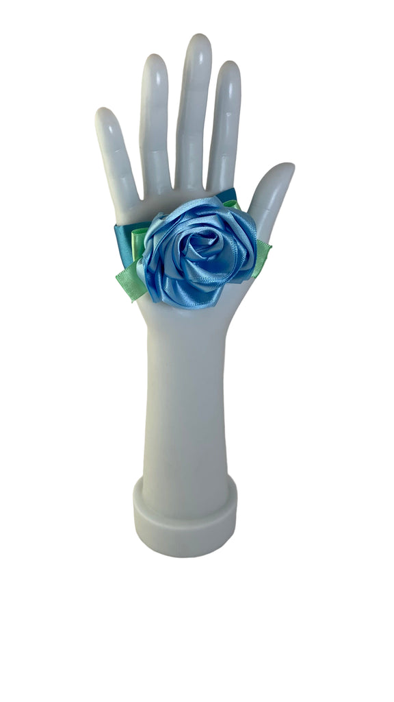 Lt blue satin rose with green satin bow, blue satin ribbon band