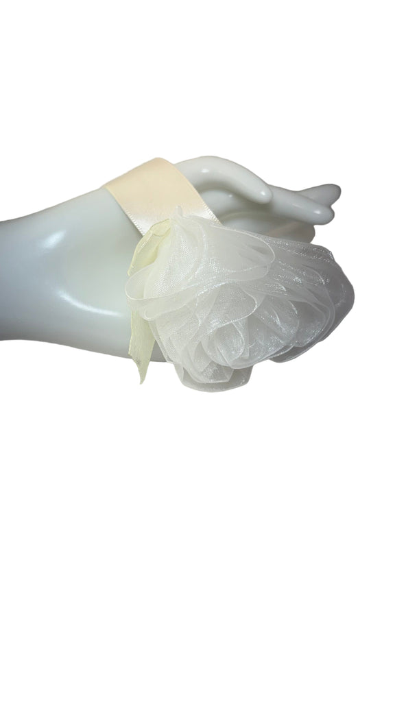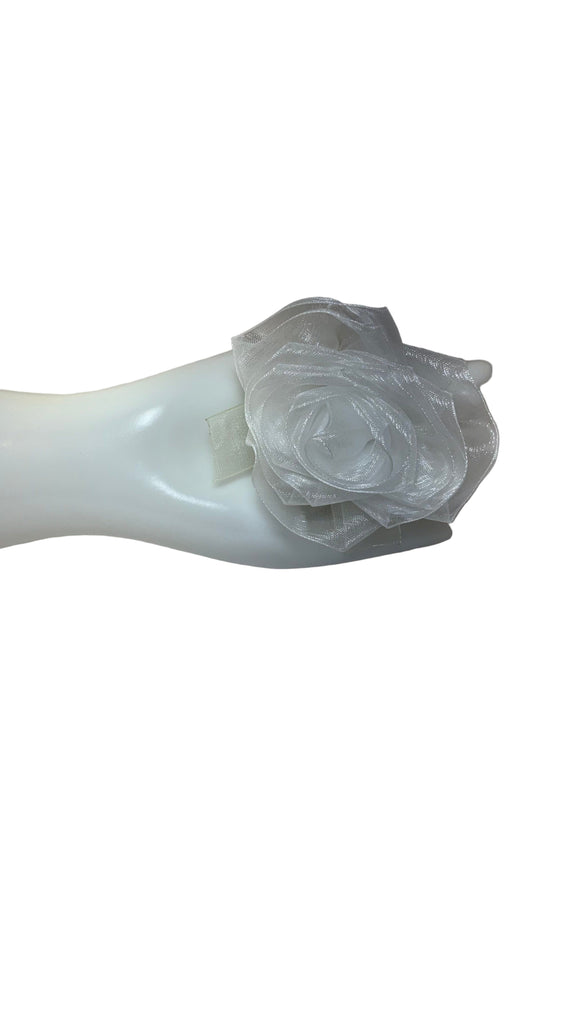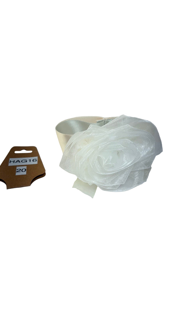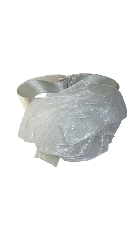 • White organza rose with white organza bow, ivory satin ribbon band