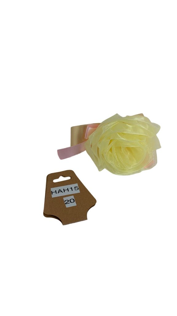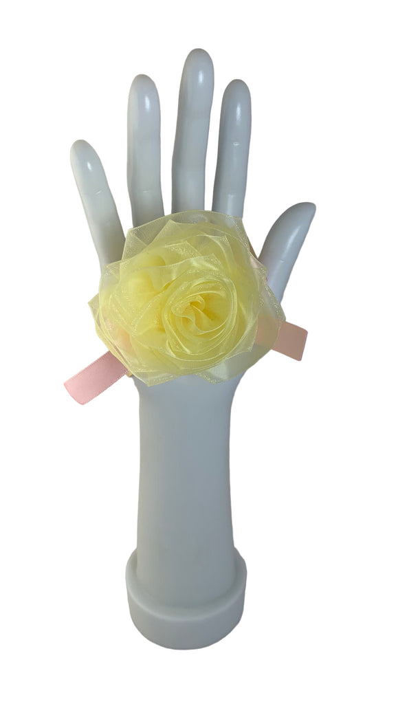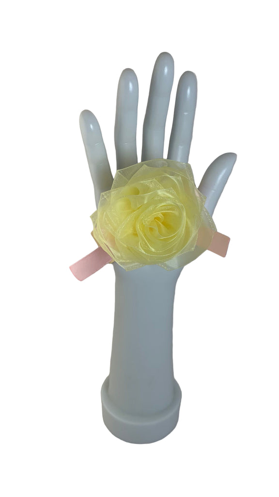 • Lt yellow organza rose with pink satin bow, cream satin ribbon band