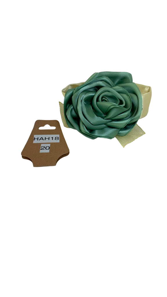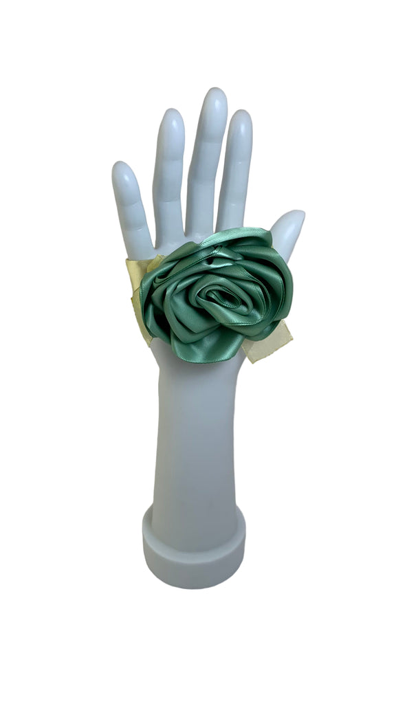 • Green satin rose with yellow organza bow, yellow satin ribbon band