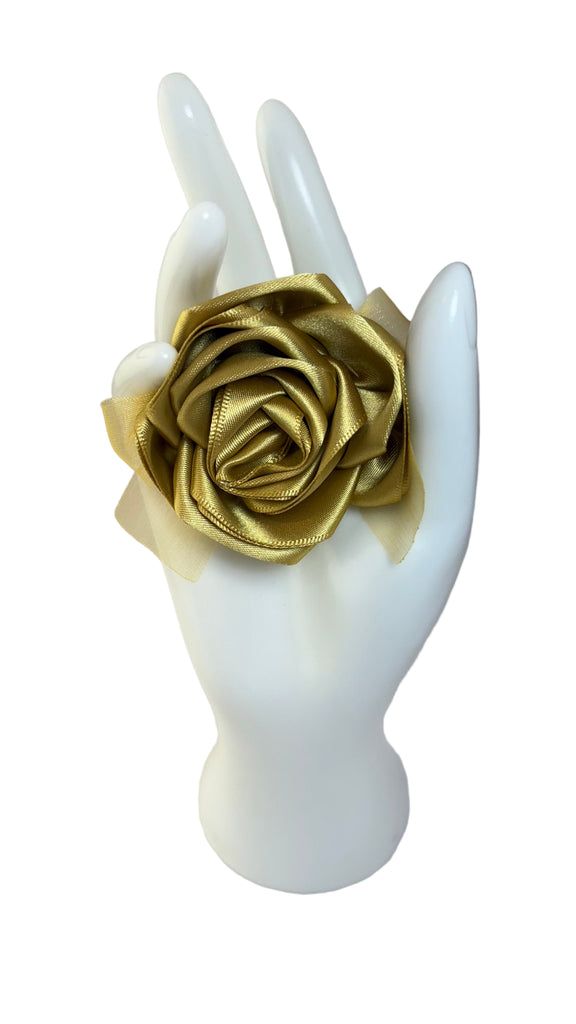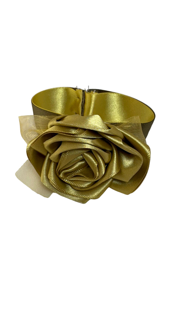 • Gold satin rose with orange organza bow, olive/gold satin ribbon band
