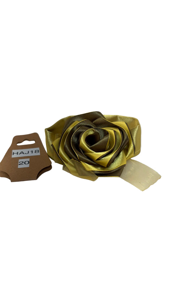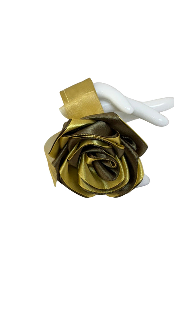 Olive/gold satin rose with orange organza bow, gold satin ribbon band
