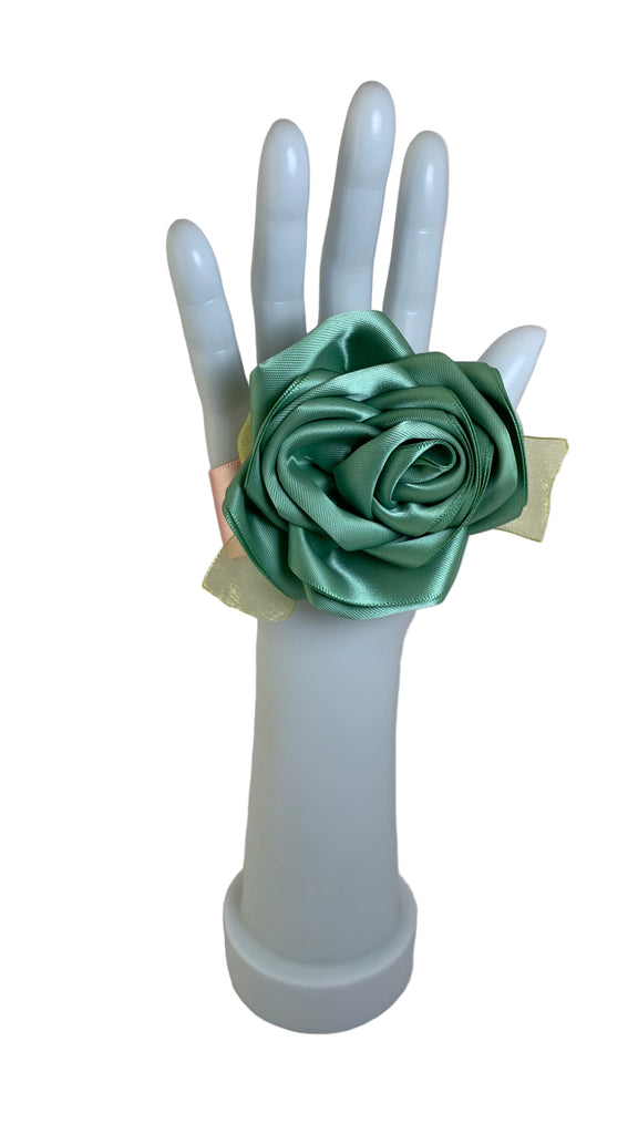 Green satin rose with yellow organza bow, blush satin ribbon band