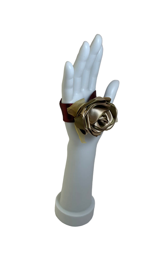 Khaki/cream satin rose with yellow organza bow, burgundy satin ribbon band