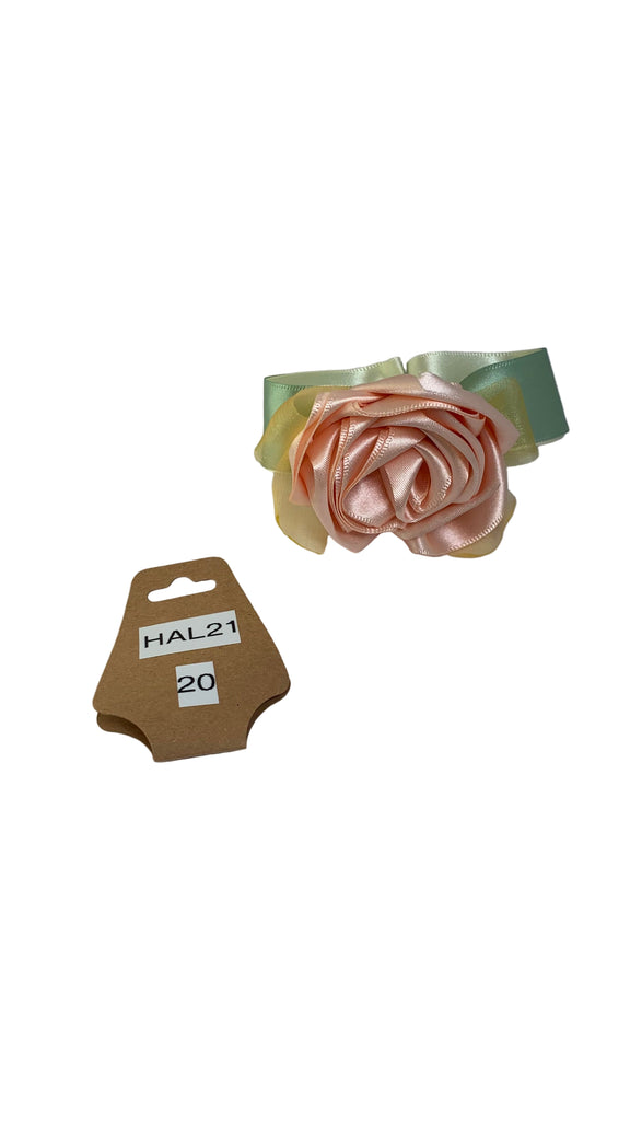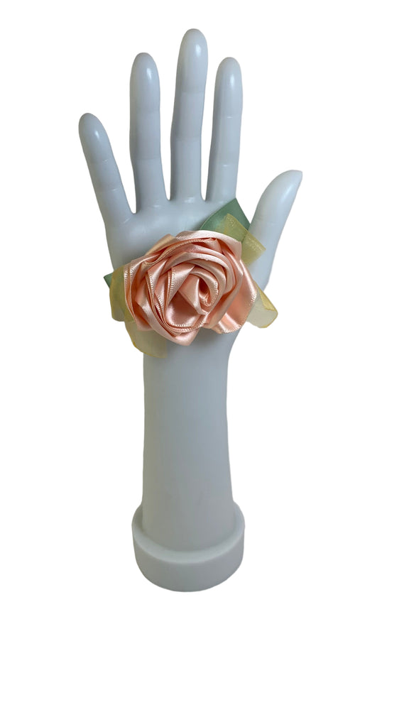 Blush satin rose with yellow organza bow, green/ivory satin ribbon band