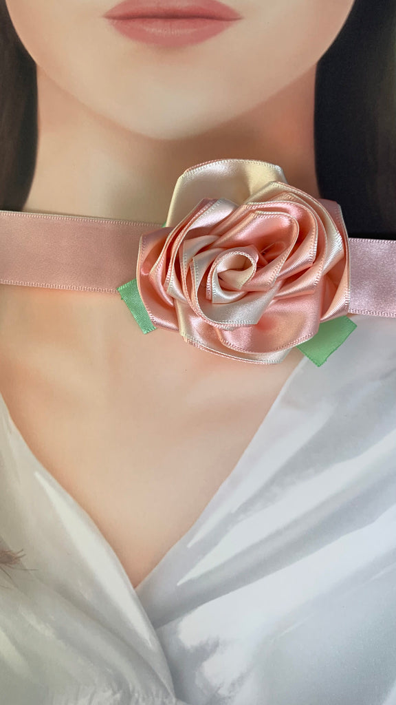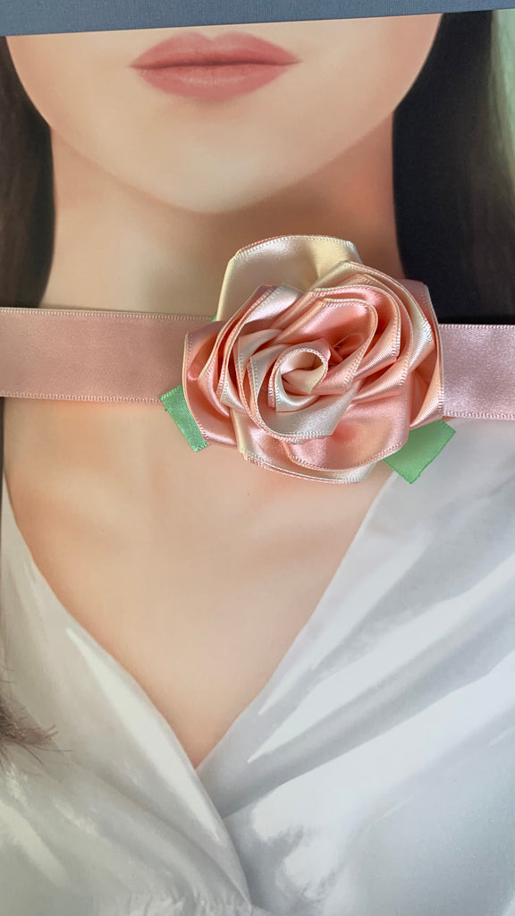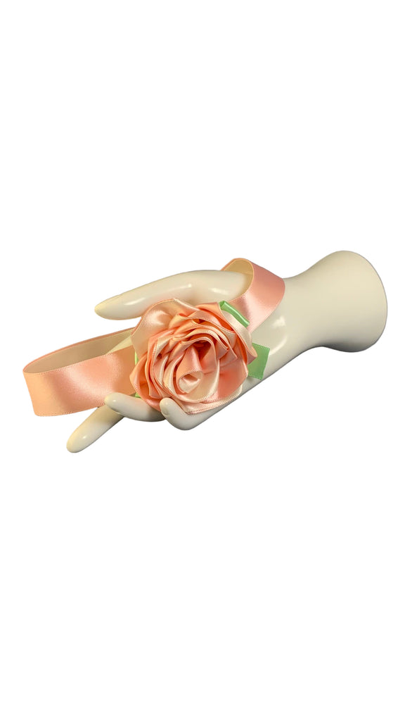 Blush satin rose with mint satin bow, blush/cream satin ribbon band