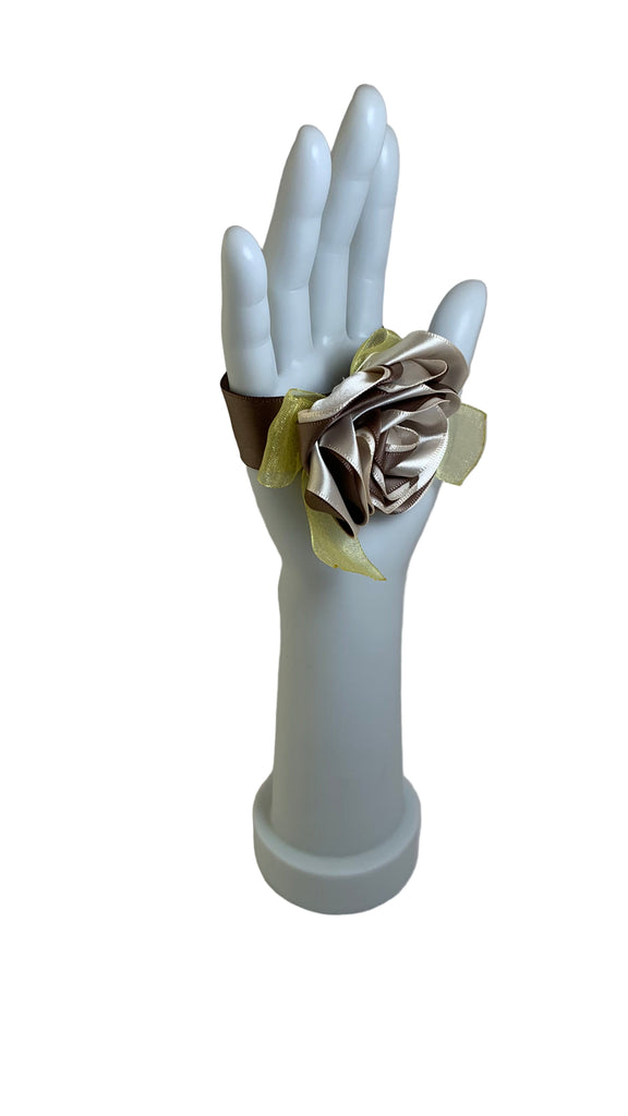 Khaki/ivory rose with yellow organza bow, brown satin ribbon band
